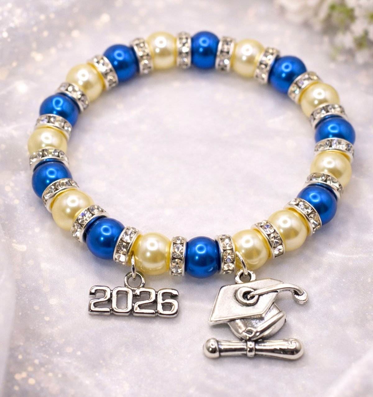 Beaded with diamond-accent spacers and elegant glass beads, this bracelet is finished with a graduation cap and diploma charm along with a custom year charm.