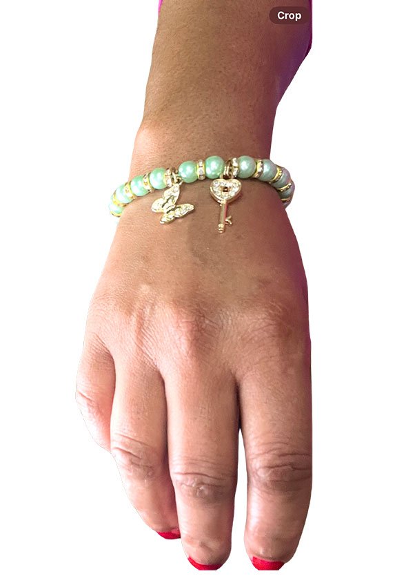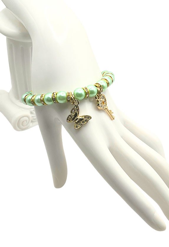 “Cultured Pearl”, Rhinestone Spacers, Elastic Stretchy, butterfly, and key charms