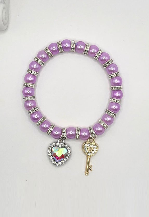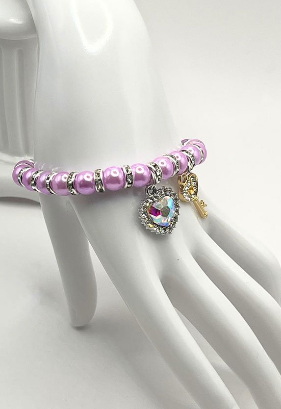 “Cultured Pearl”, Rhinestone Spacers, Elastic Stretchy, heart, and key charms
