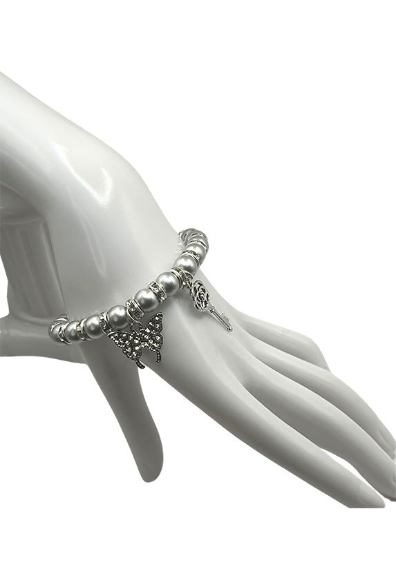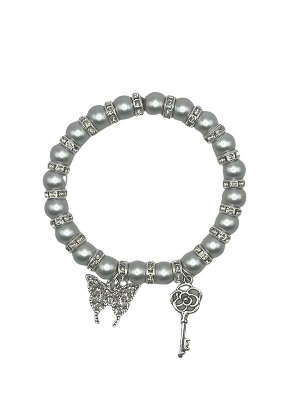 “Cultured Pearl”, Rhinestone Spacers, Elastic Stretchy, butterfly, and key charms